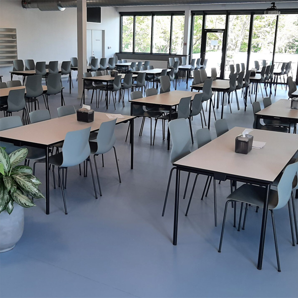 Eksamensborde i idrætssalen, kursusborde i aulaen, foredrag på biblioteket. Bordene er klar til hurtig opstilling.